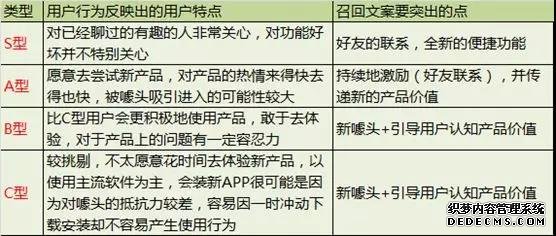 根據(jù)上面兩張表格,不難發(fā)現(xiàn):S型用戶(通話時長3h ):在應用內(nèi)已經(jīng)沉淀了人際關(guān)系,相對于對軟件的功能要求,更加關(guān)心好友。對其要利用社交關(guān)系,讓TA們知道還有很多朋友在等著TA。所以對其輸出的召回短信文案是:“你好久沒上【XXXX】啦??芍悴辉诘倪@段日子里,錯過了7個電話12個留言紅包?快升級最新版聯(lián)系他們吧!”