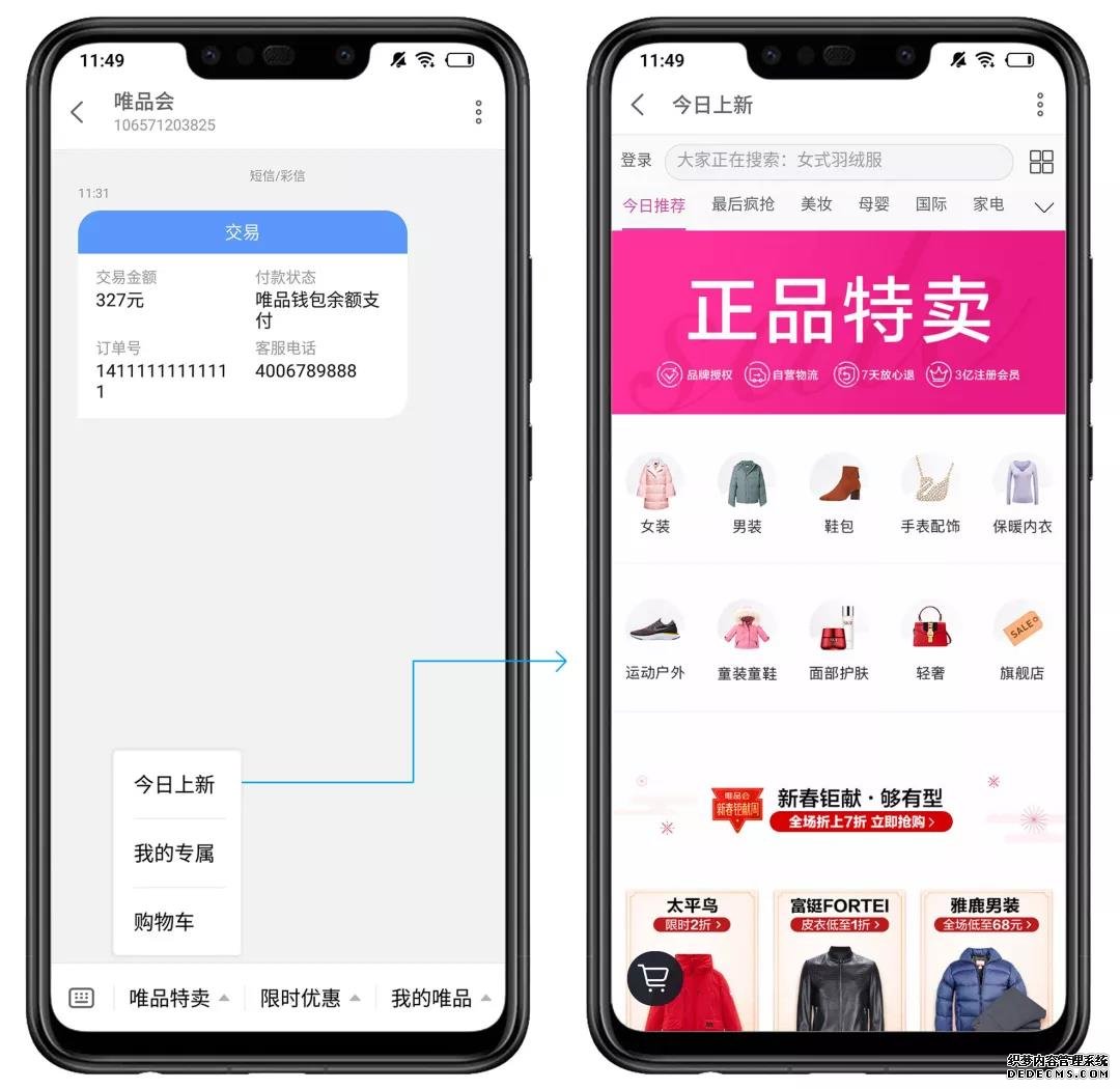 (1)在收到活動消息、或用驗證碼登陸電商平臺時,短信公眾號下方的菜單欄能夠給消費者呈現(xiàn)特賣、促銷、領(lǐng)券等業(yè)務(wù)場景服務(wù)。