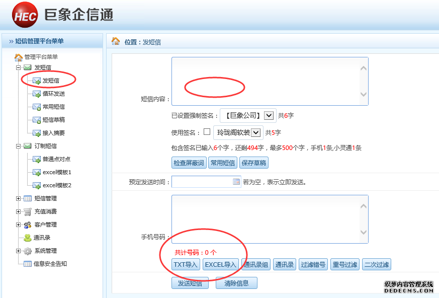 如圖所示填寫下面的短信內(nèi)容和號(hào)碼即可,跟發(fā)送普通短信一樣輸入短信內(nèi)容、導(dǎo)入號(hào)碼,導(dǎo)入號(hào)碼的方式也一樣。