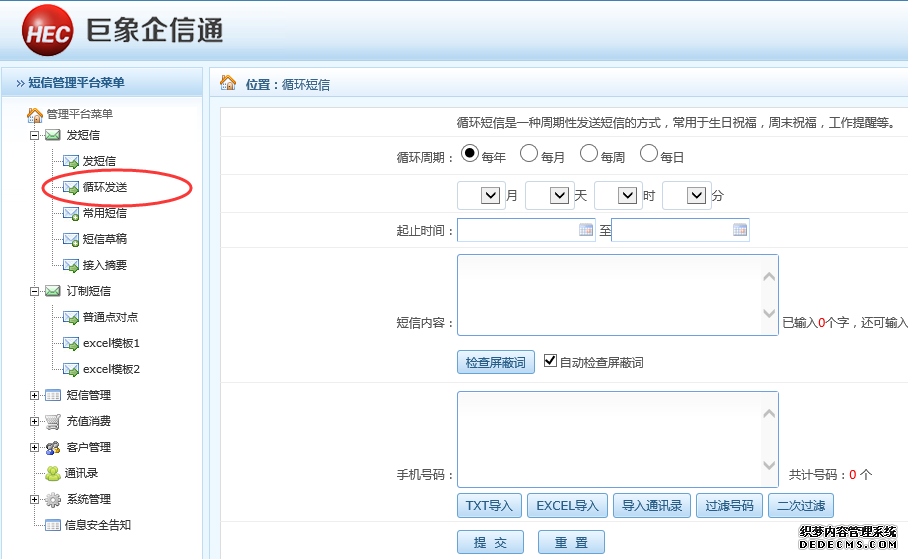 循環(huán)短信主要是一種周期性發(fā)送短信的方式,常用于生日祝福,周末祝福,工作提醒等。可以選擇每年、每月、每周、每日進(jìn)行循環(huán)發(fā)送;在這里設(shè)置起始時(shí)間和結(jié)束時(shí)間,系統(tǒng)就會(huì)根據(jù)你設(shè)置的時(shí)間來進(jìn)行發(fā)送。