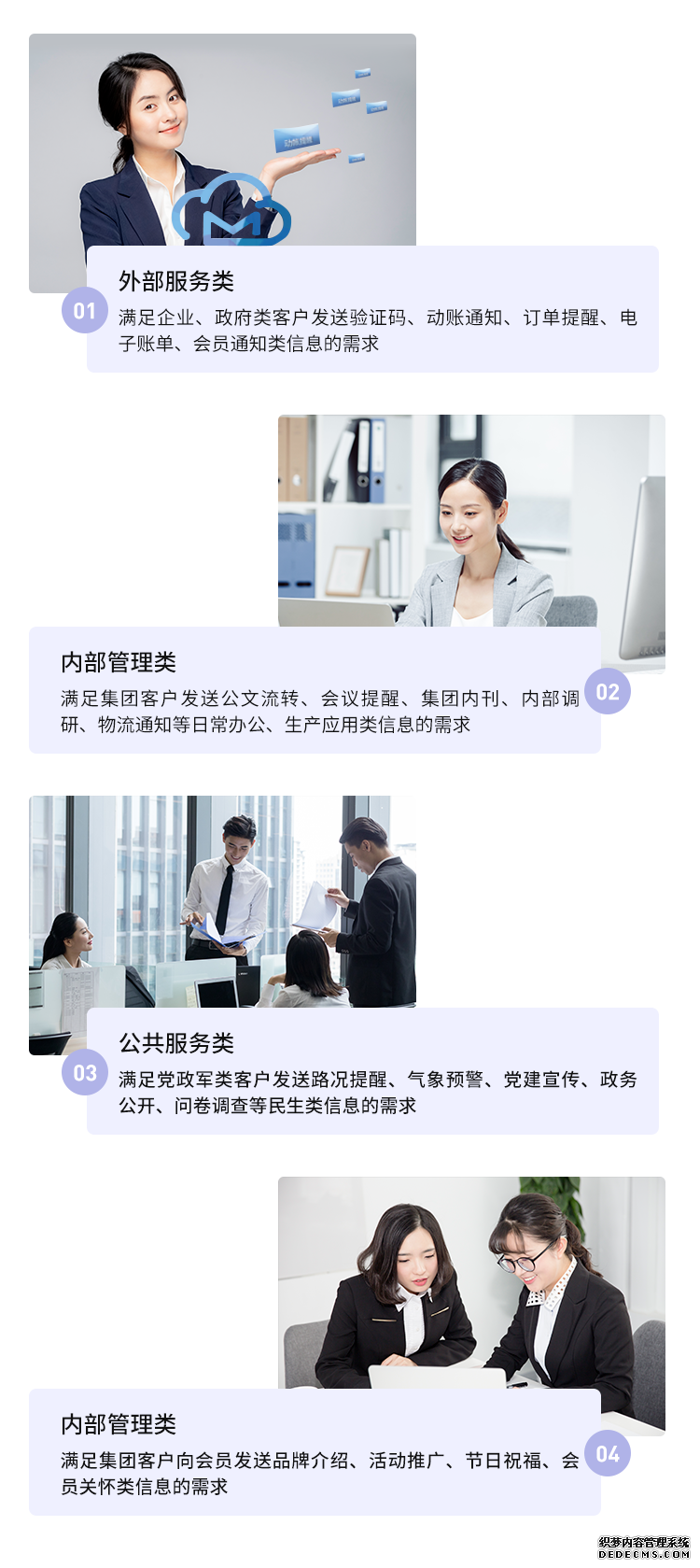 短信的應用場景除了政府公共服務應用外,還包括企事業單位外部服務類應用,如訂單提醒、電子賬單、會員通知類等信息發送;內部管理應用,如會議通知、公文流程通知等信息通知;