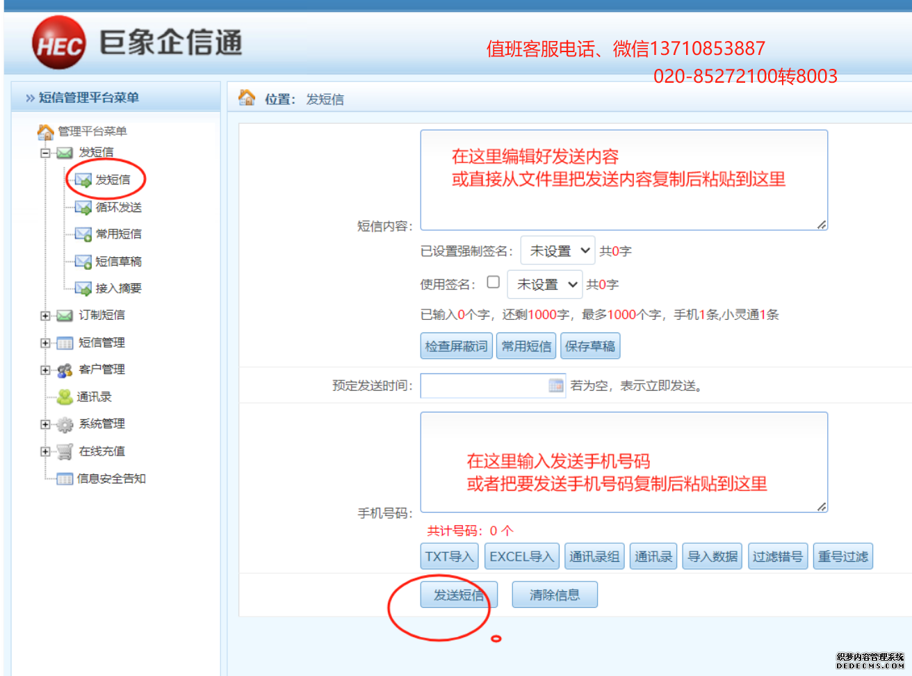 2、在“手機號碼”欄目輸入或復制粘貼要發送的對象手機號碼(一次可粘貼幾萬個號碼,粘貼上去后系統會自動整理號碼);也通過“手機號碼”欄目下方的導入方式導入號碼。如因文件格式問題導入不成功可以加客服微信13710853887或官方電話020-85272100獲得指引協助。