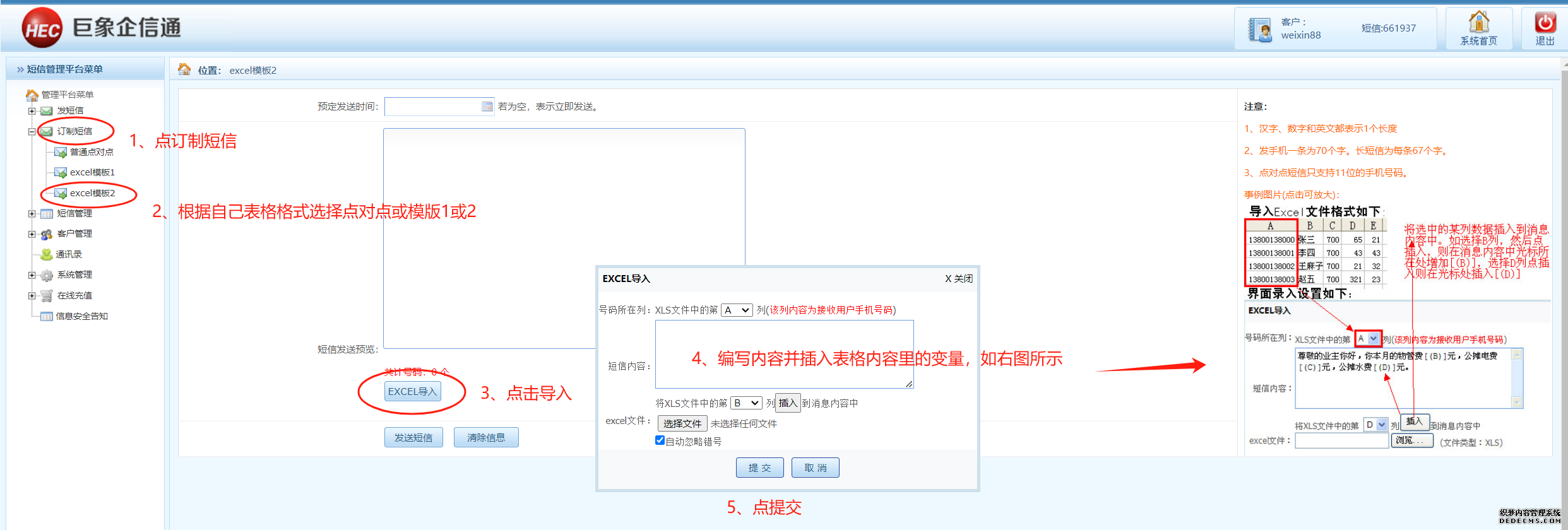 )個性化變量短信群發操作,即需要做到一個批次群發的手機號碼收到的內容不完全一樣,如內容里加入稱呼、工資條、物業費、賽事編號、座位號、學號等,如下圖所示